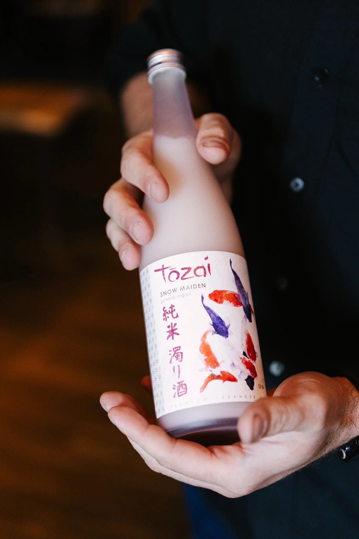 Black and white photo of a person wearing a hat and denim jacket, standing outside a wooden building with snow falling.